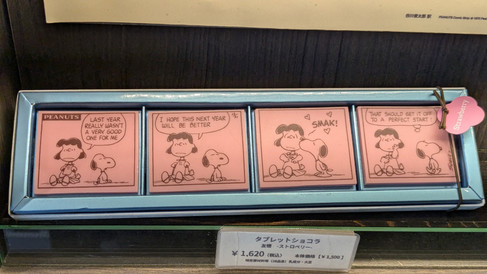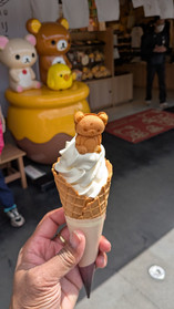 Walking around the village, Snoopy Chocolate is very popular here. I tried the ice cream cone with teddy bear cake on top—yum! I also tried other snacks but didn't really like the rice balls (that's what I'm pointing at).