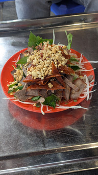 Top left Papaya Salad, then Famous Egg Coffee, Sticky Rice Ice Cream(sticky rice soaked in pandan and topped with coconut ice cream, fresh coconut and toasted coconut), slimy egg dish, Egg rolls and sweet rolls, Local HaNoi beer, dry Pho, and Banh Mi(sandwich).